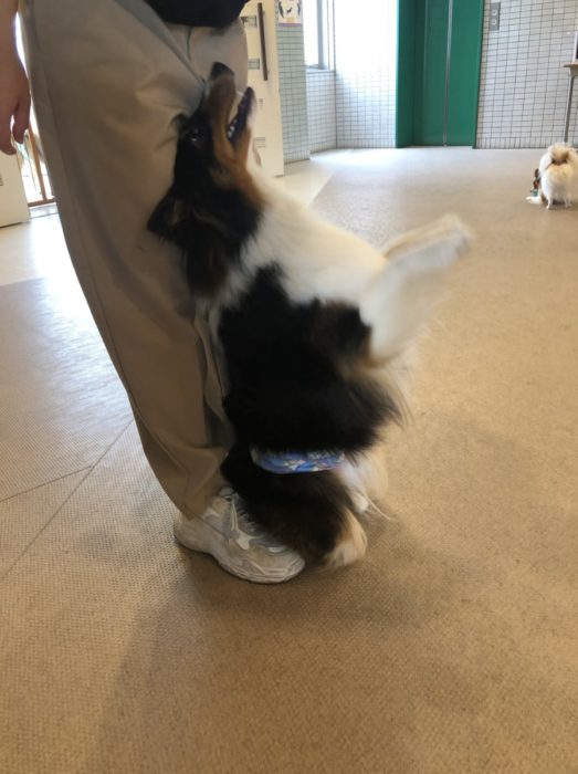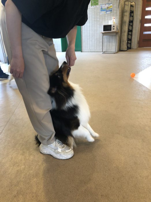 いろいろな教え方があるのですが、今日は飼い主さんの足に寄り掛かる方でご紹介しますね☆