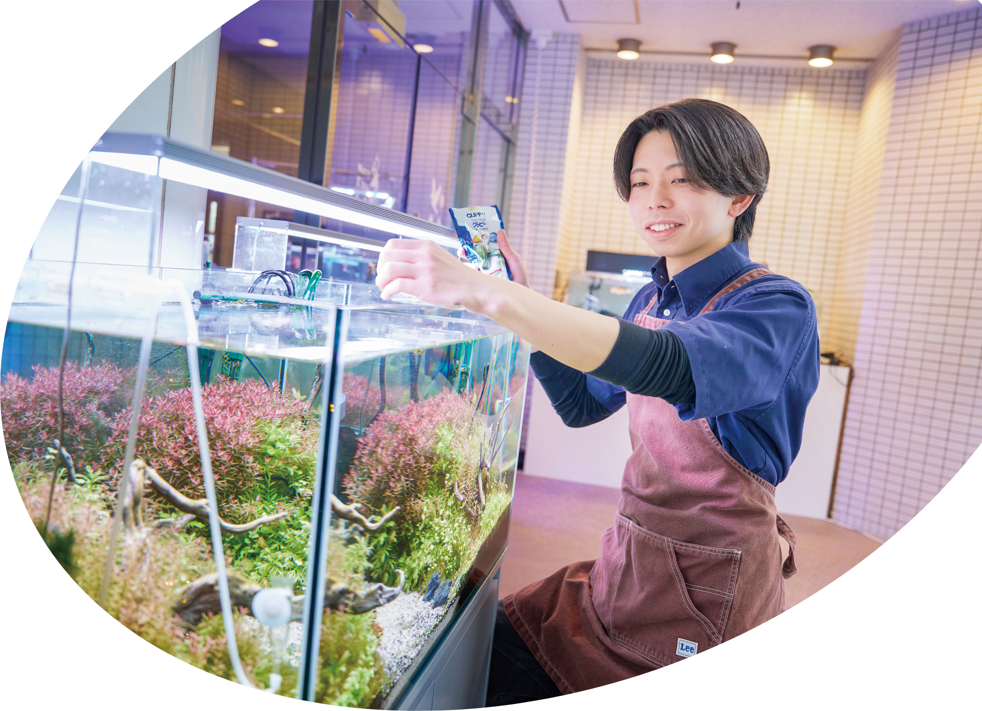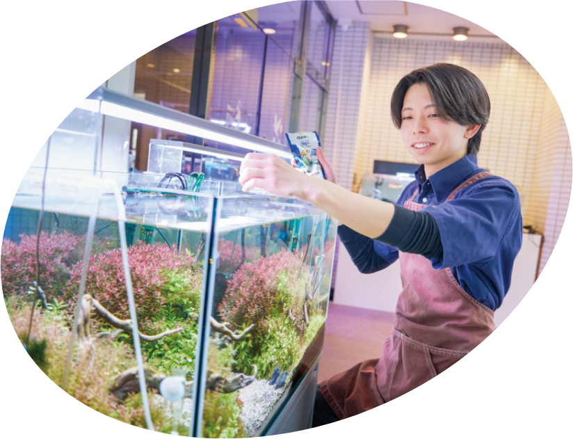 飼育専攻ではドッググルーミングやPOP広告実習を選択可能。アクア専攻では水槽を使ったレイアウト実習を行い、専門分野の技術を磨きます。