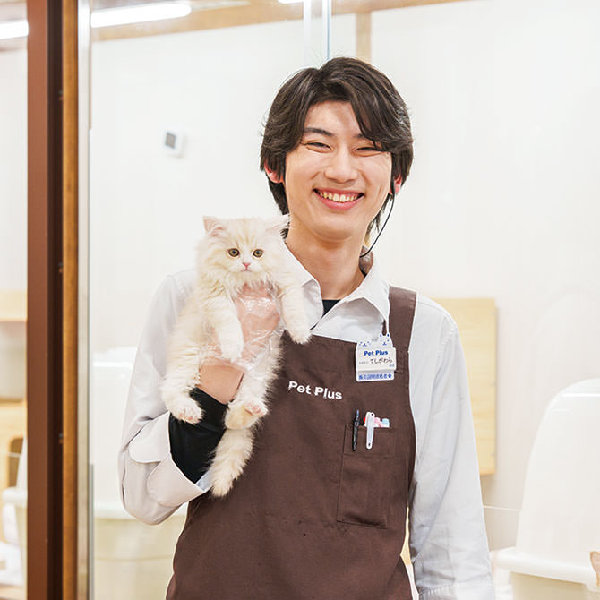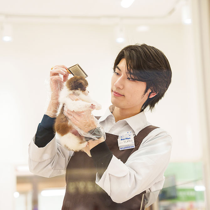 わんちゃん、猫ちゃんをお家に迎えたいと思うお客様に寄り添い、飼育相談などさまざまな面からサポートしています。もちろん時には大変さを感じることもありますが、学校で学んだ飼育管理の知識や技術を力に、乗り越えていく中で大きなやりがいを感じられます。より多くのお客様に動物と暮らす楽しさや幸せを届けられるよう、今後も尽力していきます。