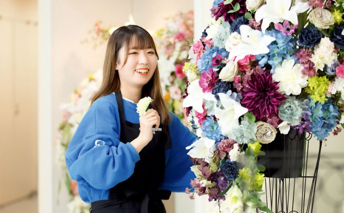 老舗生花店で勤務しています。ブライダルや仏事、会場装花などのニーズも多く、日々さまざまな経験ができています。徐々に任せてもらえる仕事が増えてきているのがとても嬉しく、大きなやりがいになっています。作業場にある花を使って練習をさせてもらえることもあり、自分の技術が日増しに上がっていくのを感じます。